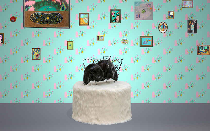 Their installation is structured around the Louse, a disturbing hybrid glass and metal monster created by Pierre Ardouvin. A wide range of colourful paintings by Anne Brégeaut, that complement this central focus, are dispersed on the wallpaper that has been specially designed by the artist, producing an overall composition effect. The multiple frames resemble a multitude of dreamscapes, revealing familiar and absurd associations. The exhibition, that is visible from the street, opens up a landscape oscillating from a domestic scene towards the strange or even fantastic.