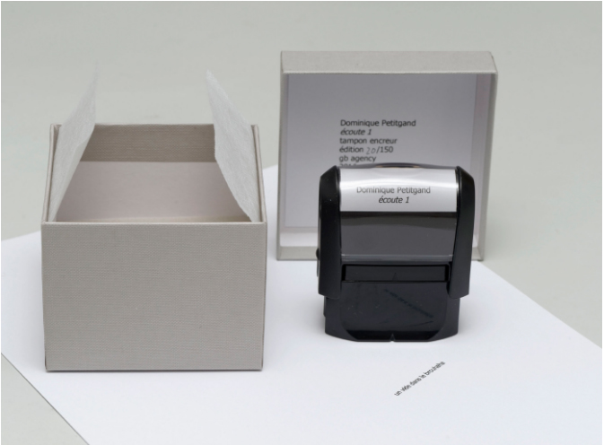 Dans ses œuvres «Ecoute 1, Ecoute 2, Ecoute 3», qui sont des tampons encreurs, l’artiste a extrait des phrases poétiques telles que «Un vide dans le brouhaha». Le lien de ces phrases n’est autre que le son. Petitgand insère donc une forme de poésie dans un objet du quotidien, répétitif qu’est le tampon.